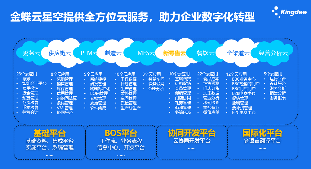 金蝶云·星辰基于金蝶云·蒼穹云原生PaaS平臺構建,聚焦小型企業在線經營和數字化管理,提供財務云、稅務云、進銷存云、零售云、訂貨商城等SaaS服務,支持企業拓客開源、智能管理、實時決策; 金蝶云·星辰還提供輕量級PaaS平臺和全面的API接口,廣泛連接生態伙伴,為小微企業提供一站式服務,助力企業快速成長